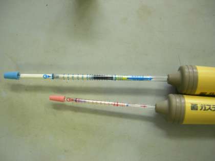 気体検知管で調べてみると,酸素は18%に減り,二酸化炭素は2%に増えていました。