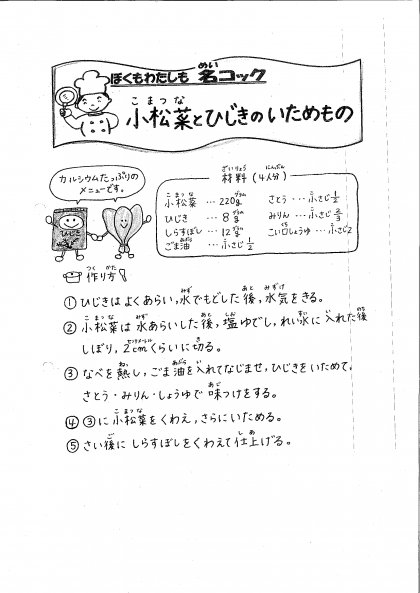 今日は,「小松菜とひじきのいためもの」のレシピをしょうかいします。