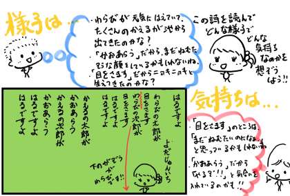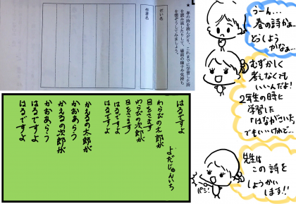 先生はちがう春の詩を見つけてきました。よだじゅんいち作「はるですよ」という詩です。みなさんはどんな場面の様子だと思いましたか?また,どんな気持ちだと思いましたか?この2つのし点で文章にまとめましょう!