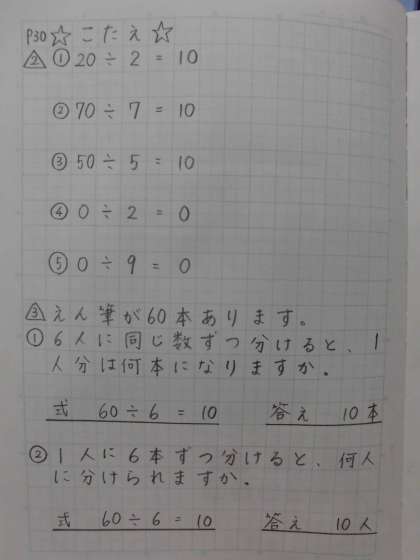 今日も算数の学習です。まず、P30のもんだいの答えあわせから始めましょう。