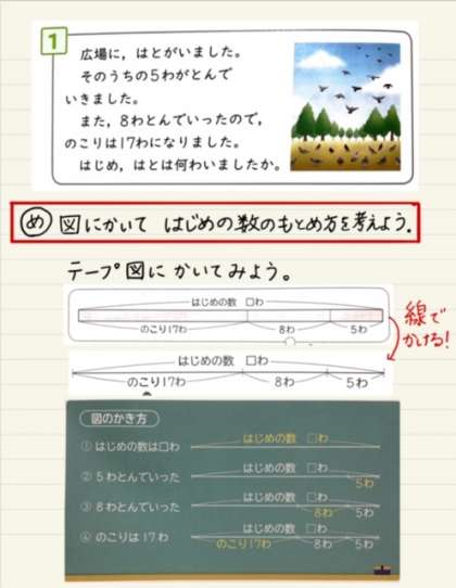 テープ図をかくときは、おはなしのじゅんにかいていくのがやくそくでしたね。