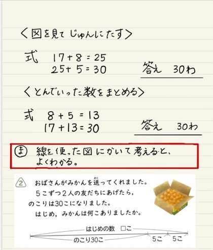 図を見て「じゅんにたす」ほうほうと「まとめて考える」ほうほうがあります。