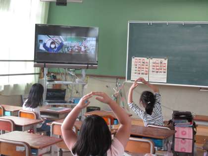 2つの教室に分かれて,一人一人間隔をあけて座ります。
