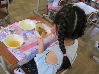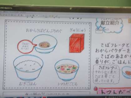 今日のおかずは,おからさばどんぶりの具と,トマトだご汁でした。どんぶりの具は,ご飯にまぜて食べます。魚が苦手な子でも,このメニューは食べやすいようで,たくさんの子がおかわりをしていました。