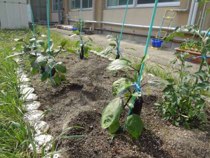 2年生が畑で育てている野菜のうち,ナスが収穫の時期を迎えています。グングン成長しています。