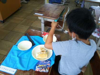 今日のおかずのメニューは,ツナサンドの具とチャウダーでした。ツナサンドを自分でパンにはさんで食べるので,1年生は少し時間がかかりましたが,楽しみながら食べていました。