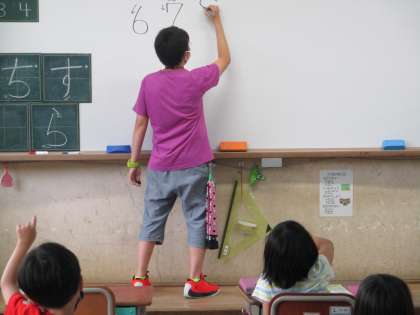 先生といっしょに,指がきをして,書き順やすうじの形をたしかめます。それから,えんぴつをもって,練習しました。