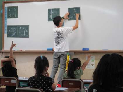 少しずつ,字形も難しくなってきましたが,1年生の書く力もぐんぐん伸びているせいか,お手本を見て,上手に形をとって文字を書いていました。