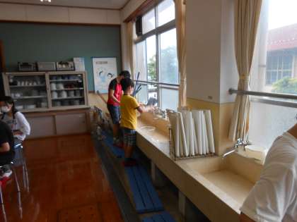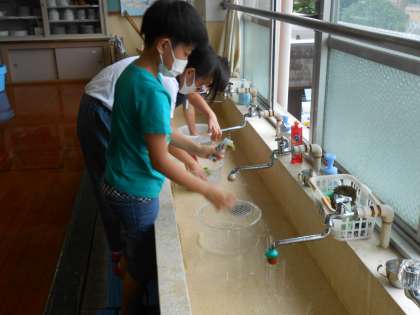 夏を涼しくさわやかにの学習で,手洗いに挑戦しました。洗剤の量を自分たちで調べて手洗いしていきました。