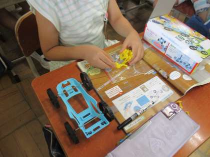 3年生が理科「ゴムや風の力」の学習のために,車を作っていました。
