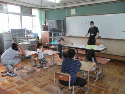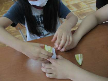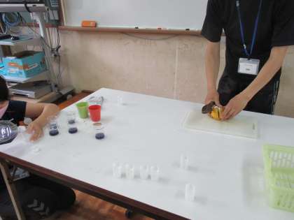 あおぞら学級が,ムラサキキャベツの液を使って,実験をしていました。レモンを絞った液を混ぜたらどうなるか,予想をしてから実験をしました。