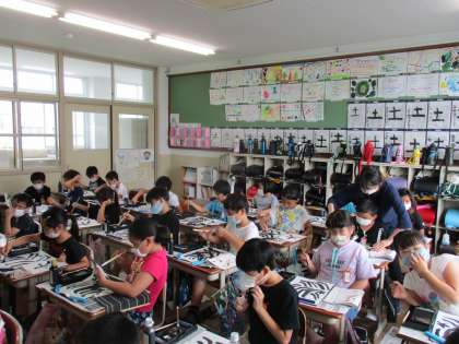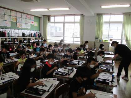先生といっしょに筆をもったり,空いているところに何度も練習したりしながら,上手に書けるようにがんばっていました。