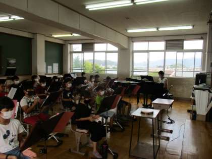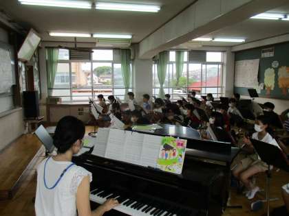 5年生は,パートに分かれてクラッピングの合奏をしています。リズムうちですが,「掛け合い」などもあり,楽しい活動です。うまく音を重ねていました。