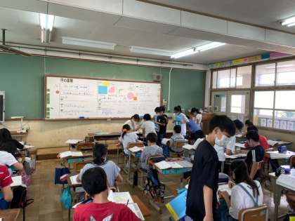 円の面積の単元が終盤にさしかかっています。今日2組では,練習問題に挑戦していました。公式はわかっていても計算がややこしく苦戦している様子でした。ミスのないように,落ち着いて計算を進めていきたいものです。