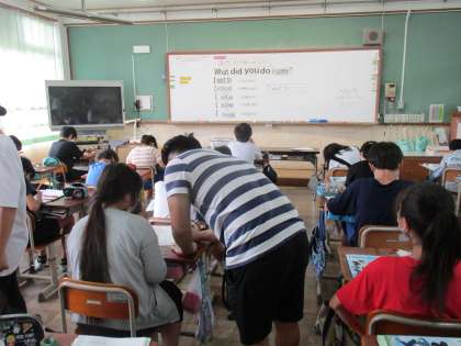 今年度から「外国語」という教科になった学習では,英語を書いたり読んだりする活動もするようになりました。今日は,担当の先生やALTの先生といっしょに「I went to 〜」と夏の思い出を書いていました。中学生みたいですね。