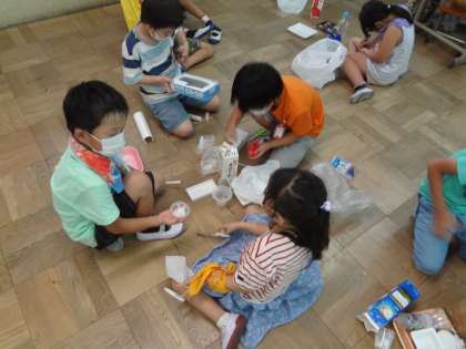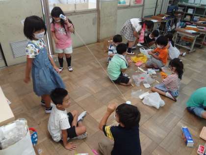 おうちから持ってきてもらった様々な材料を使って,いろいろな遊びを考えました。子どもらしい柔軟な発想で,道具がみるみるうちに変身していきました。