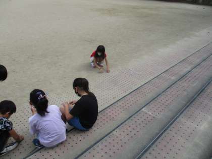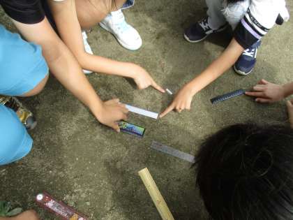 4年生が定規を片手に運動場に出ていました。地面のかたむきと水の流れ方の関係を調べるためです。今日は午後から天気が不安定です。明日,雨水の流れ方を確認できるといいですね。