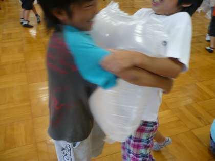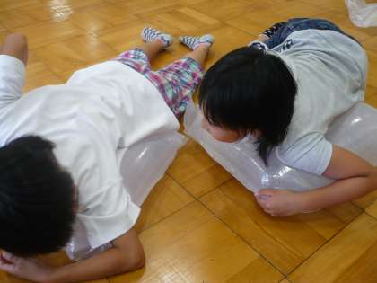 子どもたちは,空気をつかまえるために,袋にとじこめる方法を考えました。