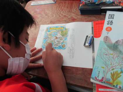 3年生は,宝島の地図をもとに物語を書いています。今は,登場人物や道の進み方,どのようにして地図を手に入れたかなどを地図やノートに書いて,想像をふくらませています。物語の完成が楽しみですね。