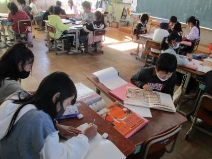 グループに分かれて魚について調べ学習をしています。体のつくりやとり方,種類などのグループがあるそうです。交流をすると,みんなで学び合えそうですね。4年生。調べ学習がんばってくださいね。