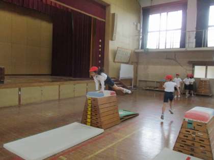 3年生は,とび箱の学習をしていました。先生に教えてもらったり,見てもらったりしながら,楽しそうに跳んでいました。台上前転やかかえこみとびに挑戦するそうです。