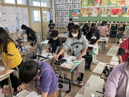 書き初め用紙を使って「美しい空」という文字を書きました。長い半紙にみんな苦戦しながらも丁寧に書くことができていました。