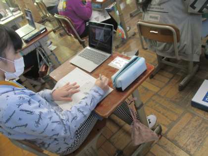 5年生がプログラミング学習をしていました。どうすれば正多角形を描くプログラミングを作れるか,ワークシートに自分の考えをまとめたり,友だちと考えを交流したりしていました。慣れた子は,複雑な図形を描くプログラミングも完成させていました。