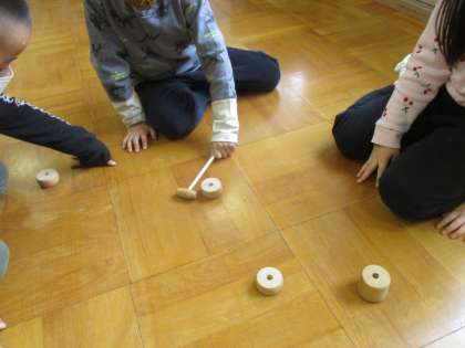 新しい昔遊びにチャレンジです。全部重ねると難しいようで,小さいものを3段重ねてチャレンジしていました。うまくいくと「やったー」という声が元気に響いていました。みんな上手になって,一緒に遊べるようになるといいですね。