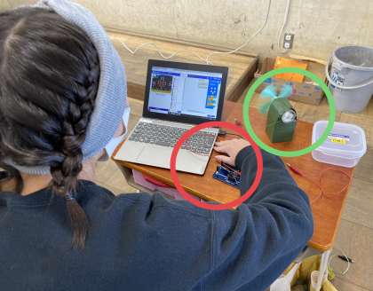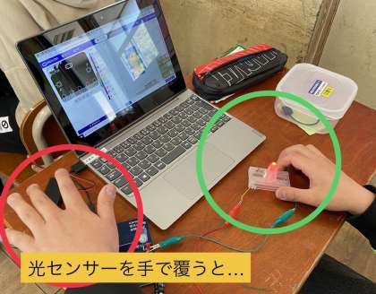 3月18日(木)は,1組と2組が理科でプログラミングに挑戦しました。メイクコードというソフトでプログラミングし,マイクロビット(小型コンピューター)につなぎました。自分の作ったプログラムでうまく動くかを確かめました。難しく,初めての挑戦ということもあり,なかなかうまくいきませんでしたが,光センサー・人感センサー・熱センサーを利用してモーター動かしたり発光ダイオードを点灯させたりすることもできました。