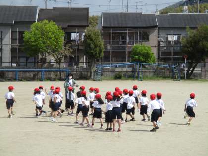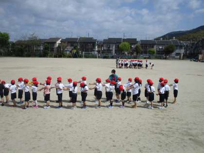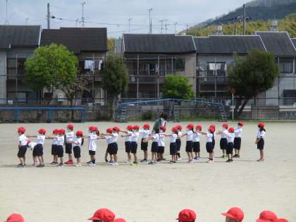 1年生は,体育の学習で並ぶ学習をしています。ばらばらになった後,「前にならえ!」。大切な学習です。