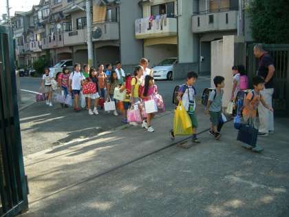 35日間の夏休みが明け,子どもたちは元気に登校してきました。手には,夏休みの宿題やお道具箱,上靴などずっしりと重そう袋をいくつも提げての登校です。集団登校に遅れる子も少なくスムーズなスタートが切れそうです。