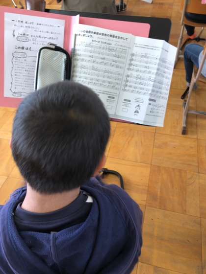 歌えない分,楽器のリズムを感じ,手拍子でアンサンブルを行いました。