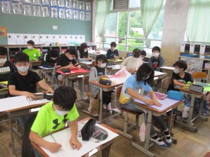 6年生は前から描いていたランドセルの絵を色画用紙に貼って,その横に文を書いていました。6年間使ってきたランドセルに温かいメッセージを送っているようで,心が温まりました。