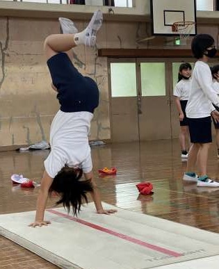 体育ではマット運動に取り組んでいます。側方倒立回転や倒立前転などいろいろな技に取り組み,自分の目標に向かって学習していました。