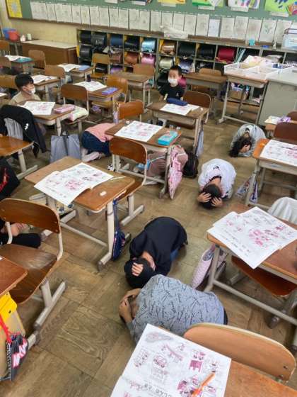 安全ノートを使って地震が起きた時の正しい行動を学習しました。1年生の時にもなかなか訓練ができていませんでしたが、とっさの先生からの急な避難訓練も頭を守る行動ができていました。