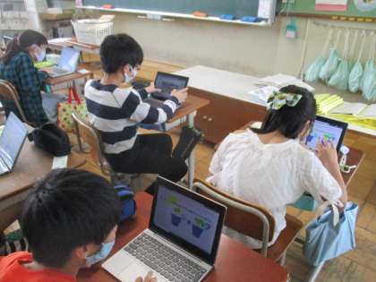 子どもたちがMicrosoft365のTeamsを使って,クラウド上で班の意見をまとめていました。班で机を合わせて,意見をまとめるのではなく,インターネット上で集まって意見をまとめている姿に少し驚きましたが,これからは,このようなスキルも大切になってくると思います。