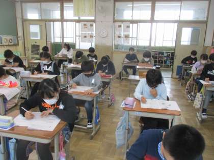 今日は,6年生が全国学力・学習状況調査に取り組みました。子どもたちはみんな一生懸命に問題に取り組んでいました。テスト終了後も,友だちと解答について話している姿が見られました。意識高く取り組めていたようで,頼もしかったです。