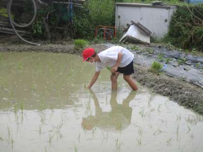 5年生は地域の先生に教えてもらって,田植えをしました。田んぼに足を踏み入れることに抵抗を示す子もいましたが,「楽しかった。」「もう一度したい。」という子がたくさんでした。