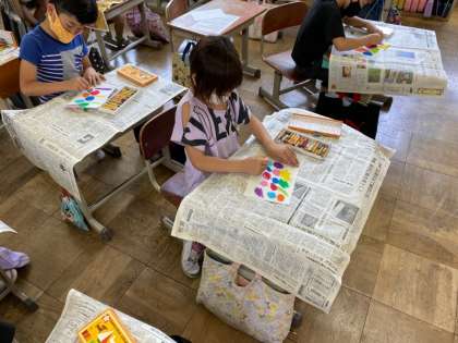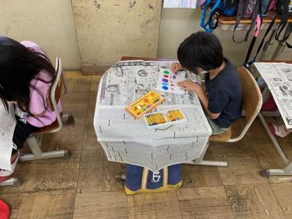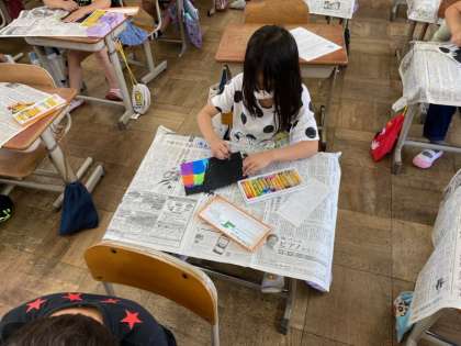 色々な色を重ねて黒を上から塗ることに驚きながらもスクラッチしていくと「おぉー」という驚きの声が出てくる素直な二年生でした。