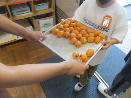 あおぞら学級のみんなが畑で収穫したビワを職員室に届けてくれました。正しい言葉遣いで礼儀正しく届けてくれました。