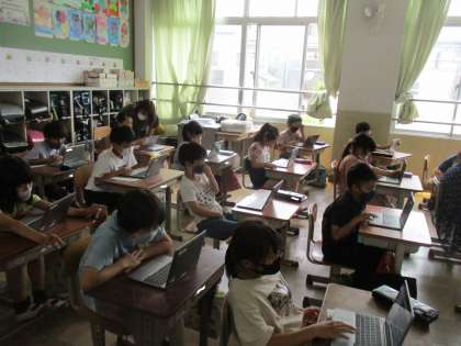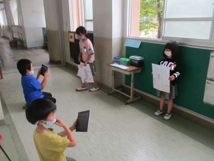 今年度も実際に会って交流ができないので,GIGA端末を活用して学習をしています。自己紹介動画を撮ったり,友だちと意見を交流したりしながら活動していました。これからが楽しみな3年生です。