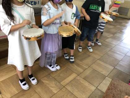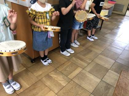 またタンブリンの使い方もみんなで確認し,グループに分かれて練習しました。