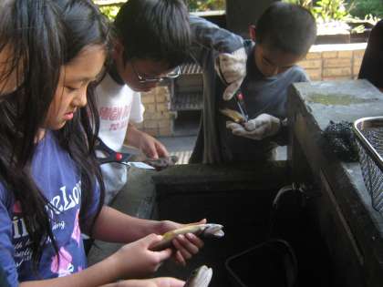 午後からは,はじめに魚つかみをしました。素早く逃げるイワナを必死で追いかける子どもたち。「必ず一人一匹とる!」を目標にがんばりました。グループのみんなが応援し,なんとかみんなイワナをとることができました。その後,いよいよとった魚の調理にとりかかります。恐る恐る魚をさばいて何とか塩焼きにしました。もちろんおいしかったのですが,活動後の感想の交流では「命の大切さ」や「いつも調理してくれる方への感謝の気持ち」が語られました。また一回り大きくなった子どもたちです。
