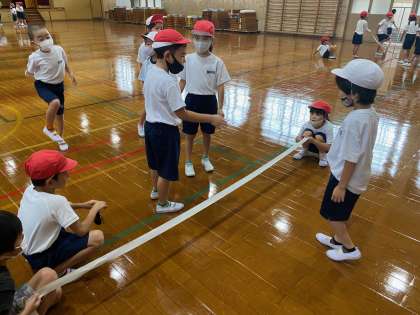 とびあそびの学習でゴムとびを行いました。グループで協力して飛んでいました。