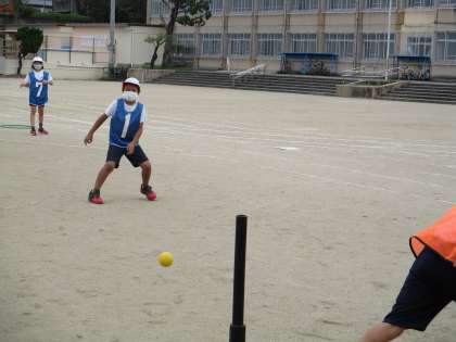 先週から始まった,「ハンドベースボール」の学習。