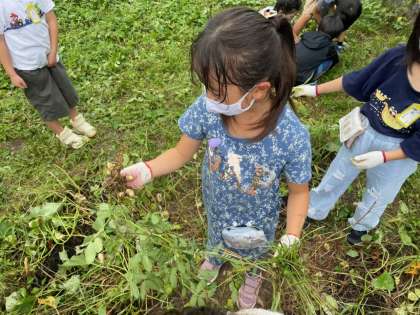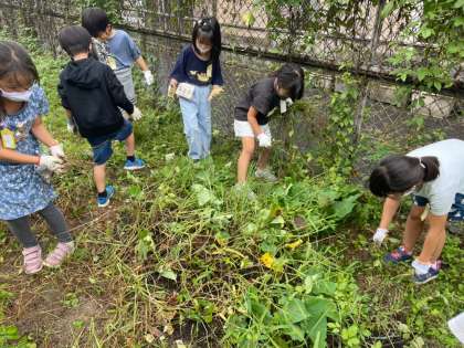 サツマイモを育てていますが,雑草が大量にはえていてうまく栄養がいかない状況でした。そこでクラスで分かれて草取りを行いました。2組はサツマイモを抜かないようにするのが大変でした。収穫が楽しみです。