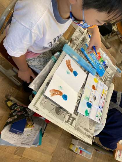 技法パート2はデカルコマニーをしました。独創的なデザインが多かったです。色々な技法をつかんで色々な経験をして3年生に上がりましょう♪