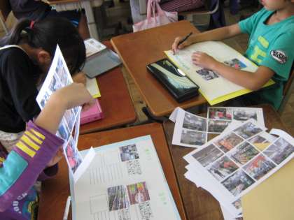社会見学のまとめをしています。調べたことをパンフレットにまとめています。写真を貼ったり,キャラクターを考えてかいたりして,工夫してまとめています。社会見学がとても楽しかったようで,子どもたちは意欲的に学習のまとめをしています。パンフレットの出来上がりが楽しみですね。
