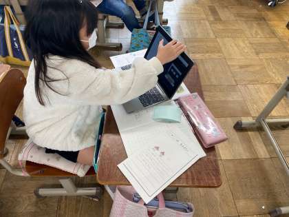 算数では絵を見て問題を作りました。それをタブレットで写真を撮って全員で交流しました。一つ分がいくつ分あるかに気をつけてできていました。
