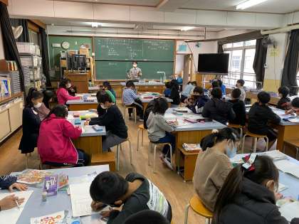 理科室でペットボトルをあたためたものを氷水に入れたときにどうなるかの実験をしていました。子どもたちの反応もあってとても楽しい雰囲気でした。